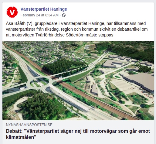 Vänsterpartiet Haninge länkade till en debattartikel från Vänsterpartiet på sin facebook-sida: