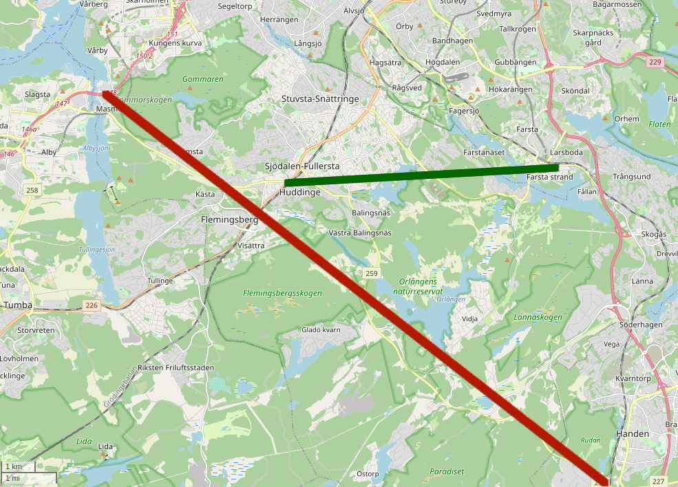Kortfattat kan jag beskriva mitt förslag, Tvärbana Södertörn, som en dubbelspårig järnvägstunnel mellan Nynäsbanan vid Farsta Strand och Stambanan mellan Huddinge Central och Flemingsberg. Dessutom ingår förstås också att Nynäsbanan ska få dubbelspår hela vägen ned till avfarten till Norviks Hamn.